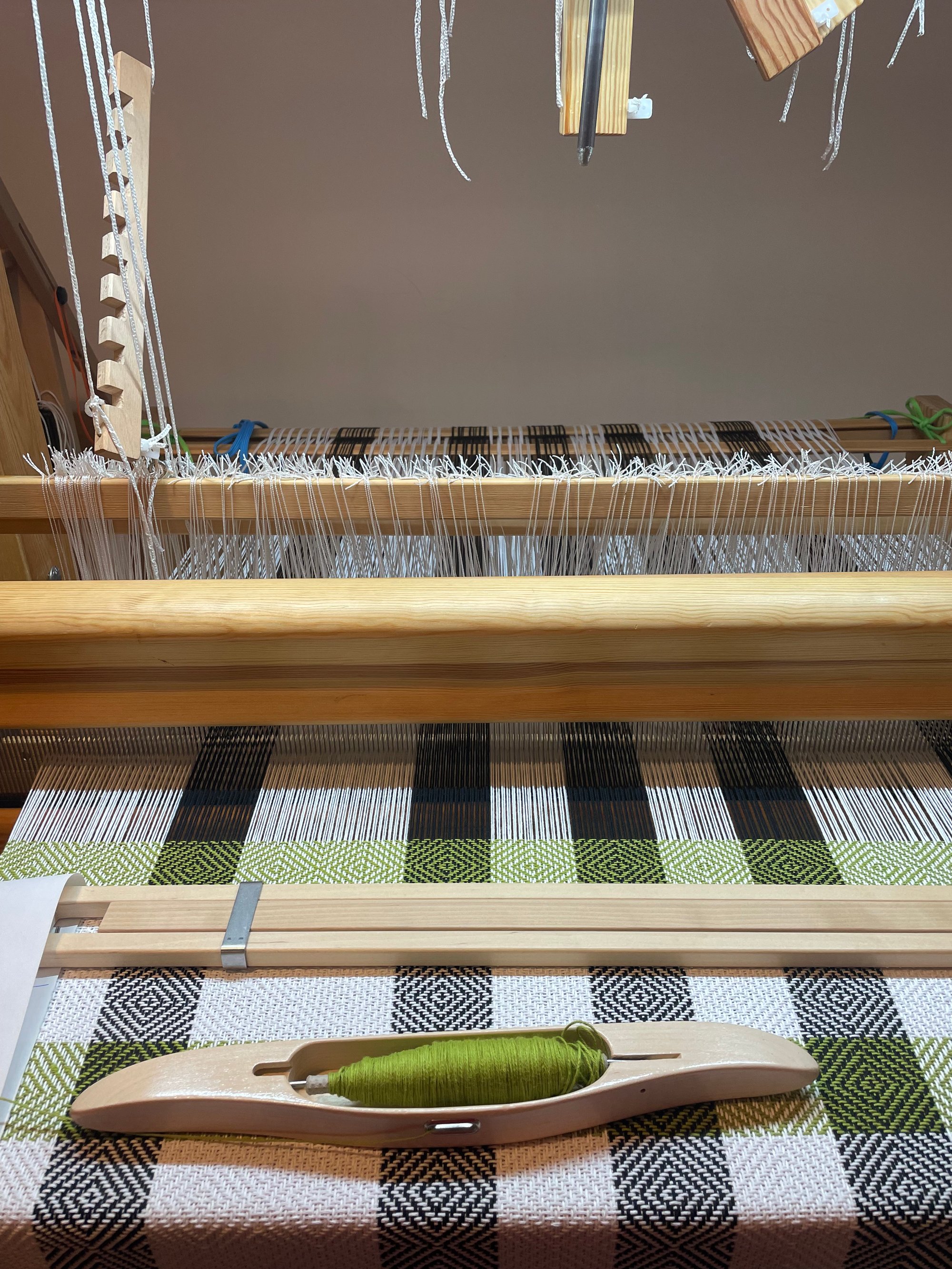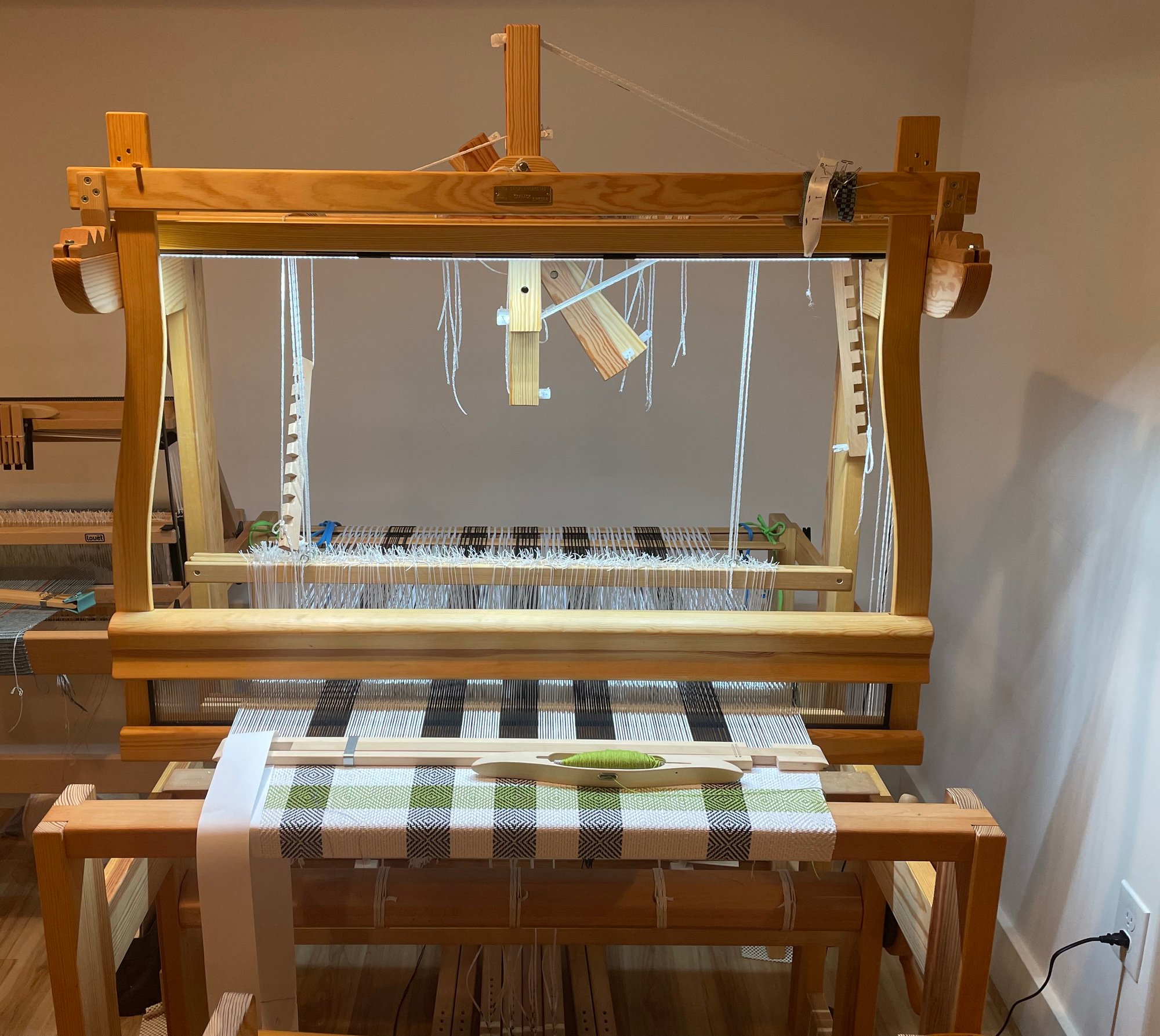 Photo of the light bar mounted on the Lilla with the green and white warp courtesy of Clever and Classic Handwovens. This weaver had her loom drilled by a carpenter and opted to locate the cord on the right side of the loom.